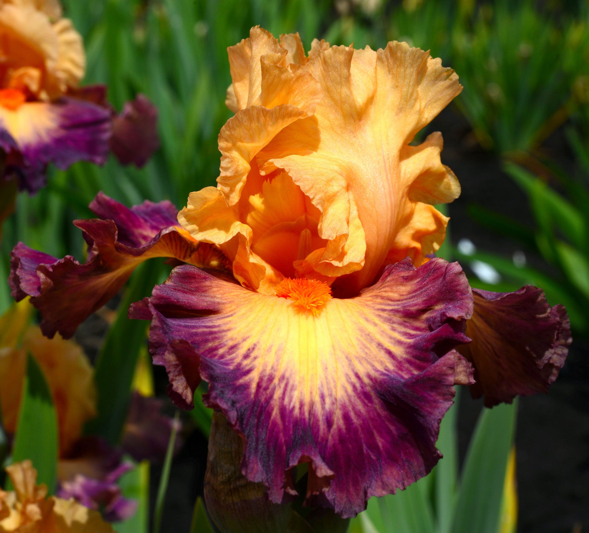 81 cm mid-season to late bloom standards apricot style arms chase yellow falls apricot blaze wide blending to rubient edged port wine beards atomic orange.