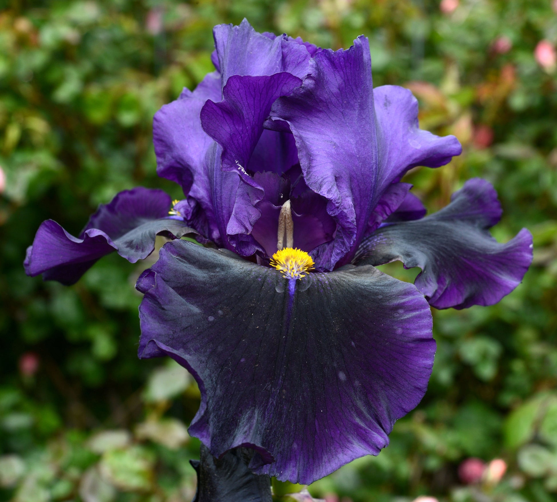 Very early to early bloom. Standards velvety deep pansy purple (RHS 83A); style arms deep purple; falls velvety deep purple, center near black; beards old gold, prominent; heavily ruffled; leaf bases purple; sweet fragrance