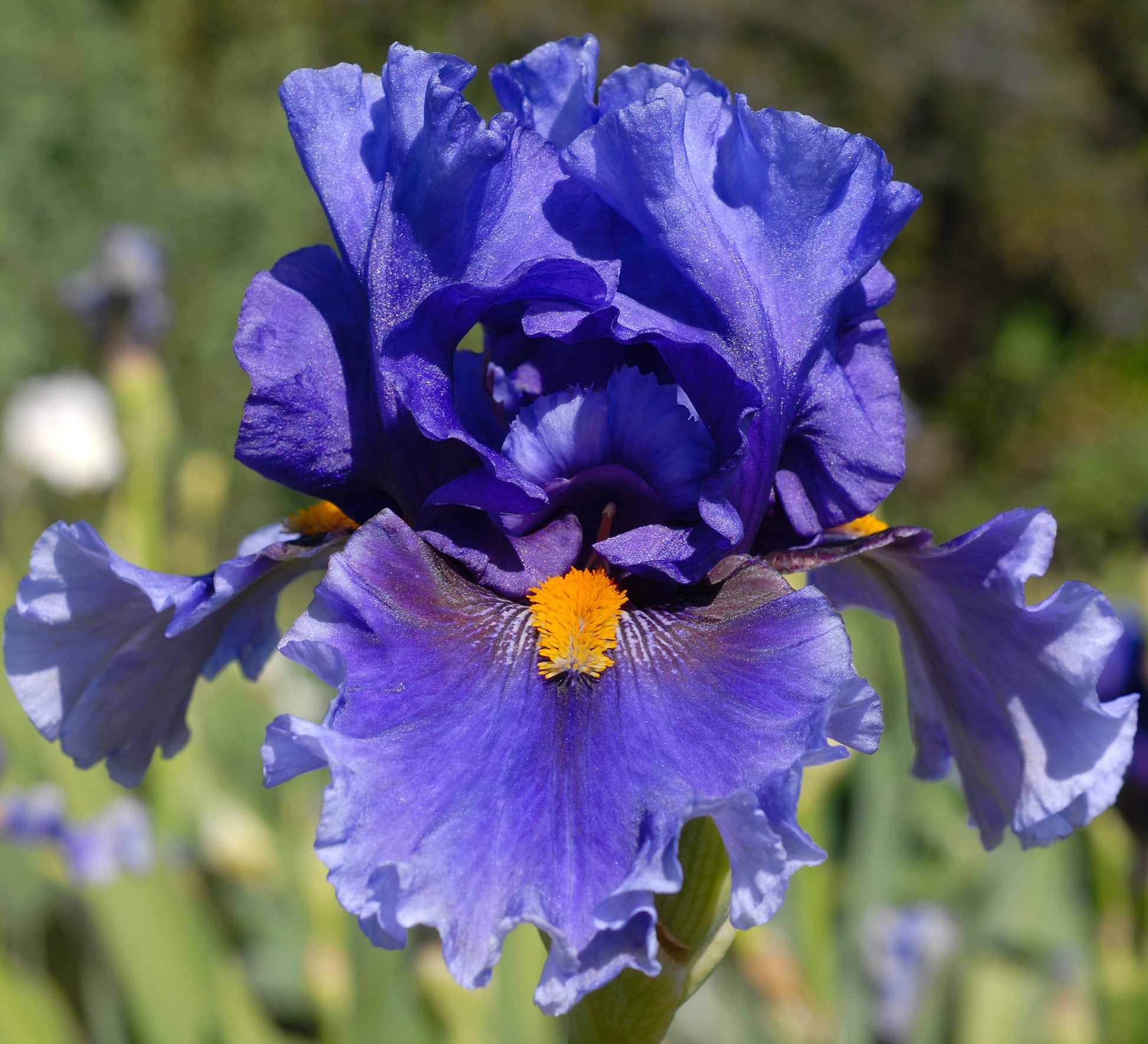 Midseason bloom. Standards dark blue purple, waxy sheen, blending to medium violet blue edge; style arms medium violet blue; falls dark blue purple, pale violet, white diffused band, darker plum brown hafts; beards gold; heavily ruffled; pronounced sweet fragrance. Honorable Mention 2000