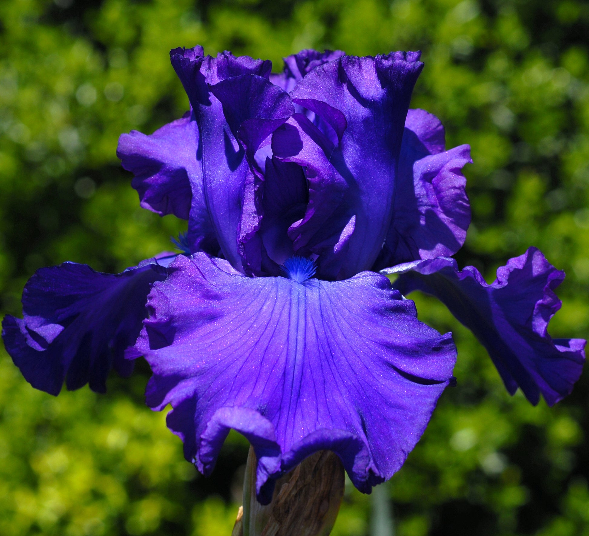 Midseason bloom. Deep royal purple self, beards dark purple, ruffled.