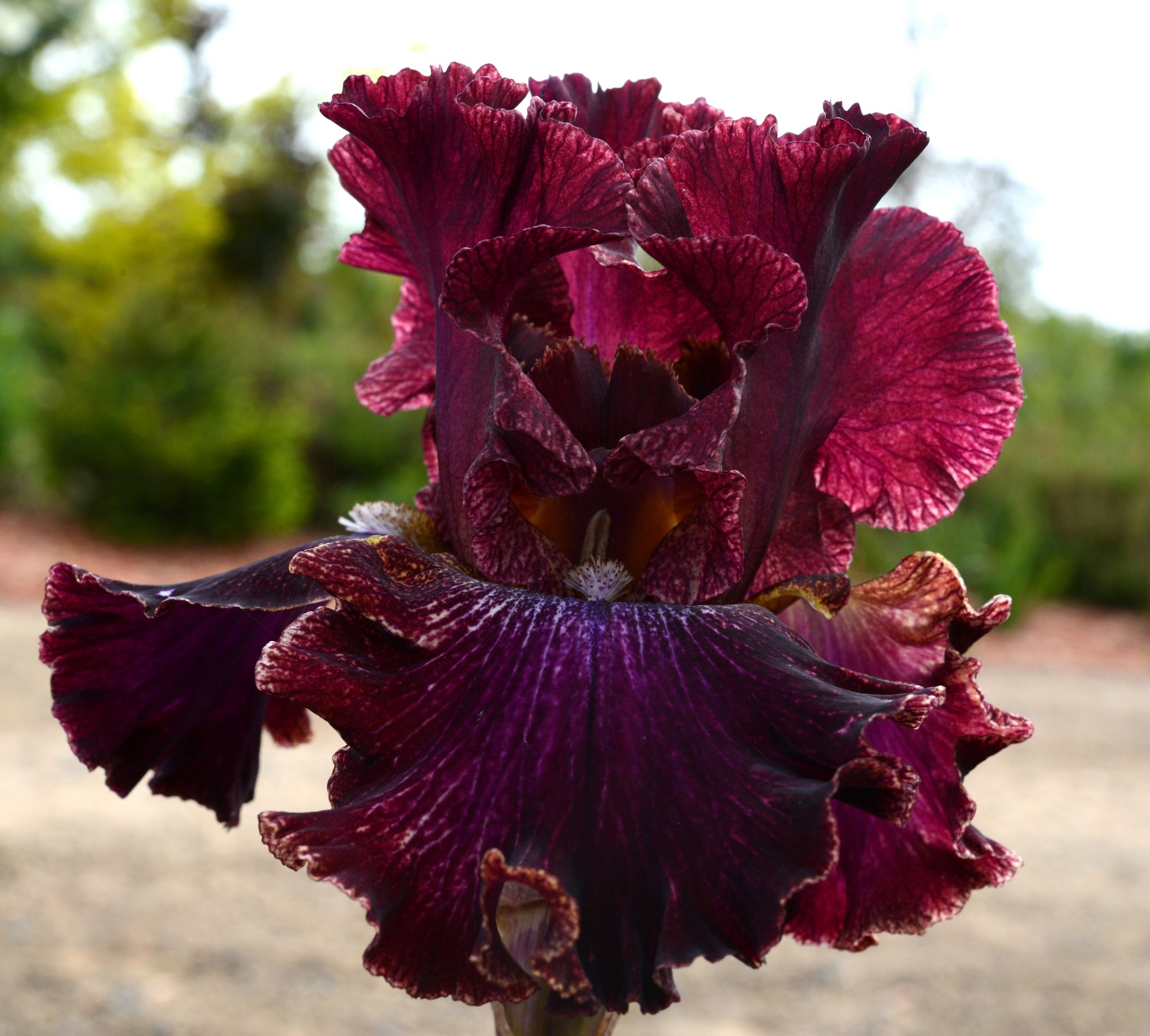 Late bloom. Standards clean white, edged with narrow gold halo; style arms white, gold edged crests; falls white overlaid by dark purple lines which become solid purple at lower edges, wide yellow hafts and bands; beards golden yellow; ruffled; slight fragrance.