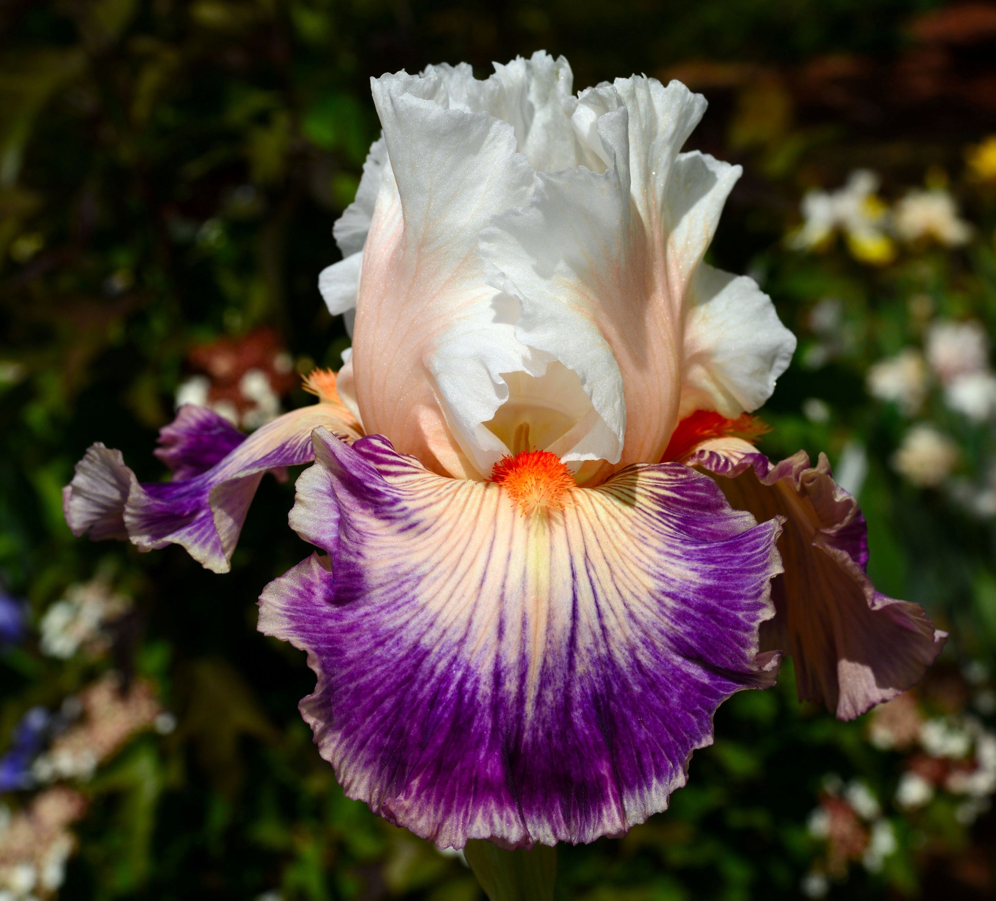 Early to midseason bloom. Standards pale pink, coral pink midrib; falls red violet, large coral-pink sunburst, pink halo around edge; beards red.