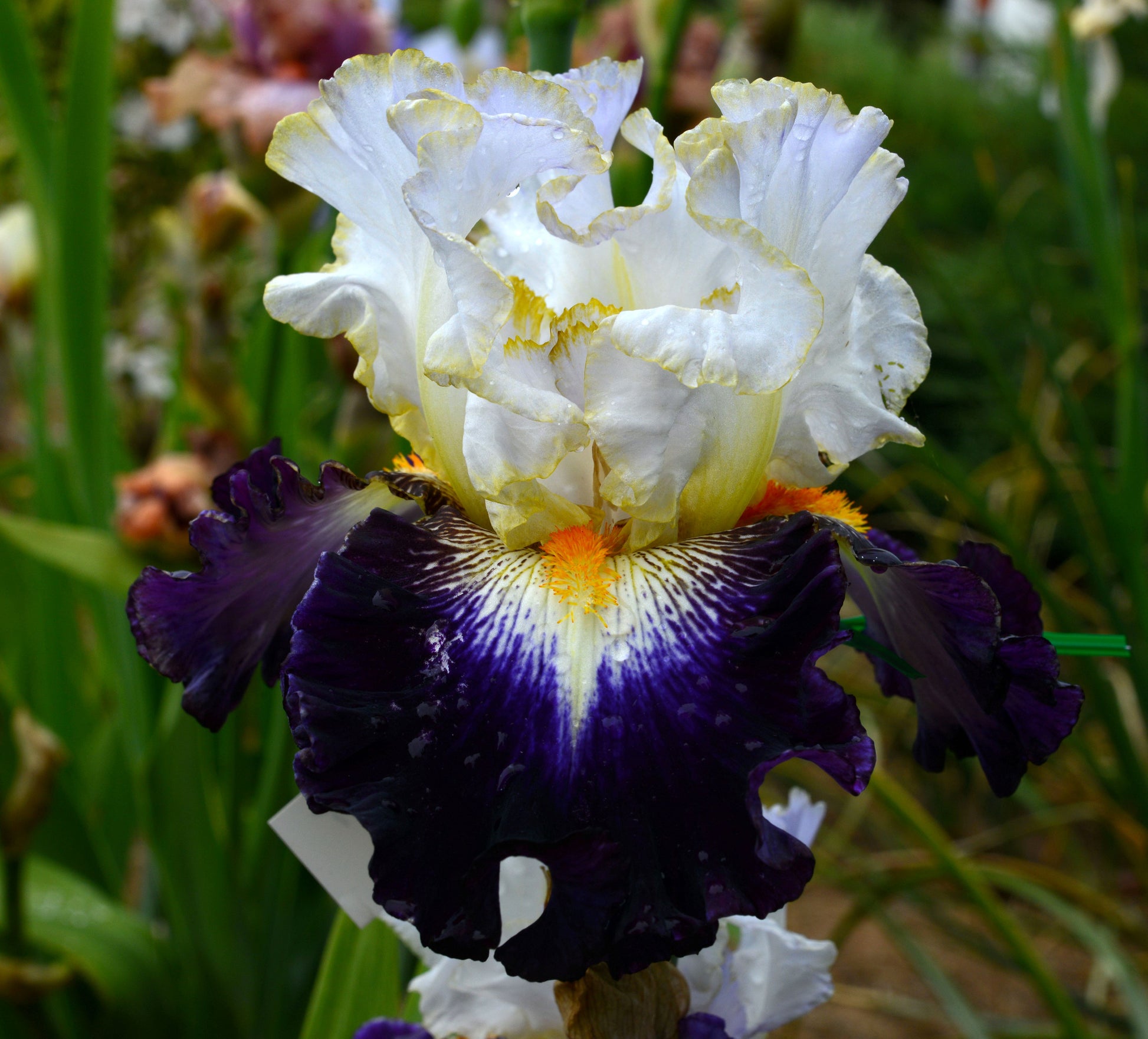 Late bloom. Standards icy blue white narrowly banded glittering brassy gold: style arms blue, white, crests edged gold; falls very dark purple, white flash lined and dashed dark purple beside beards, clean white dart at end of bright yellow beards; ruffled; musky fragrance.