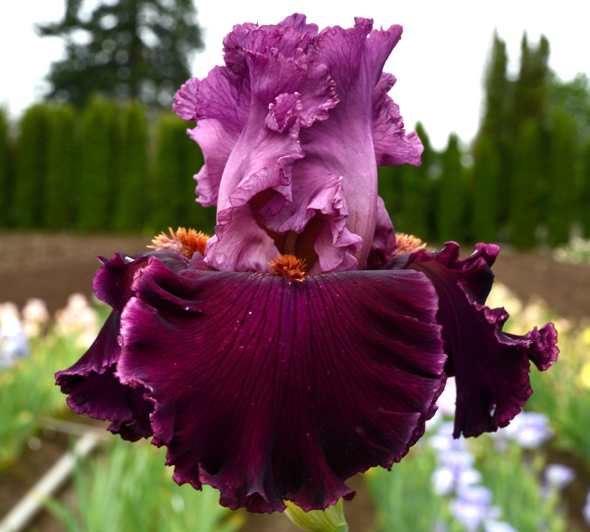 Midseason bloom. Standards hot pink-rose; style arms buff; falls dark garnet, pink rose edges, subdued white veins around smoldering orange-red beards, plush, velvety; sweet fragrance.