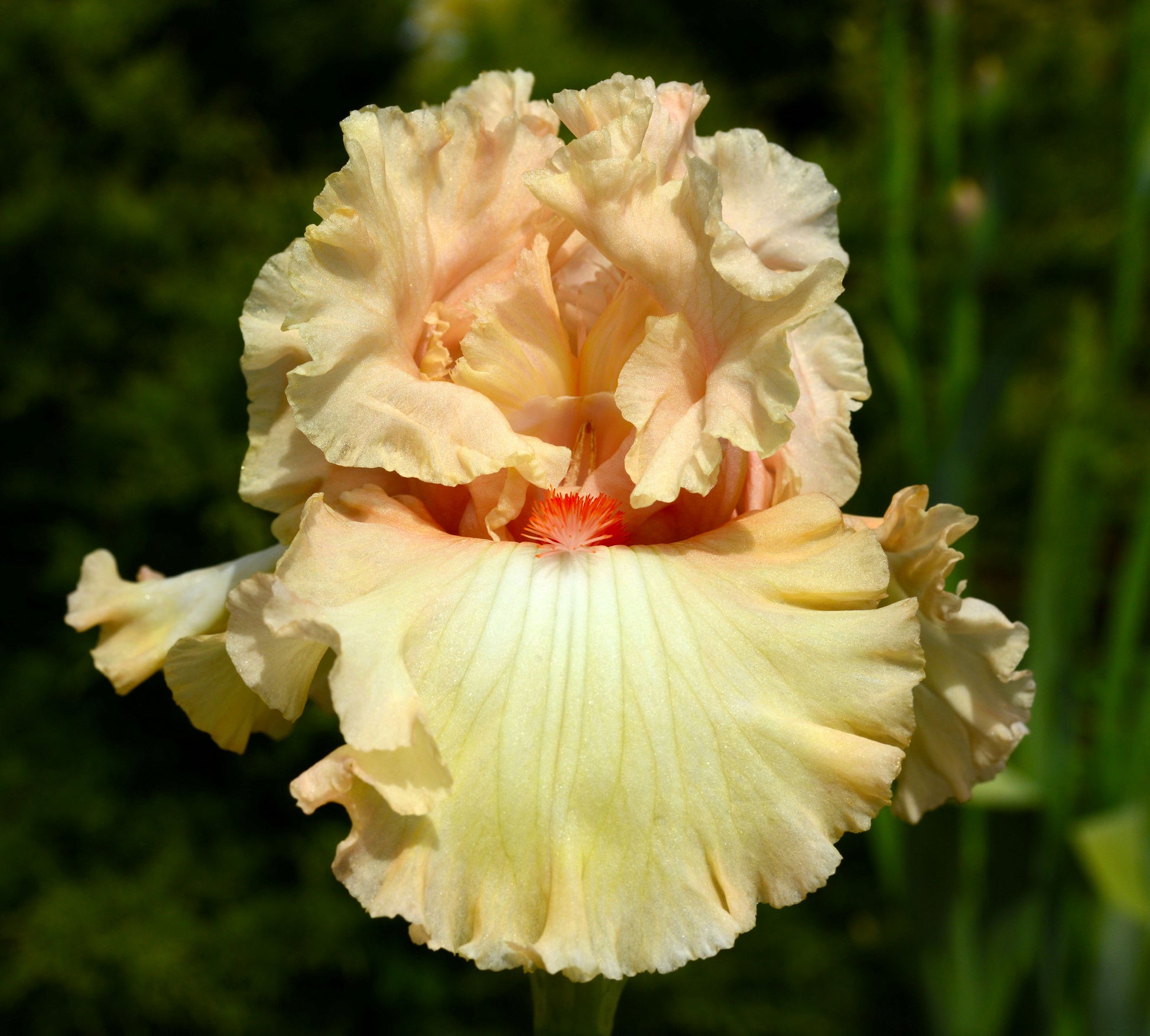 Early midseason bloom. Standards cream, pinkish flush; style arms cream; falls cream, center paler, slight peachy cream touch on haft; beards fire red.