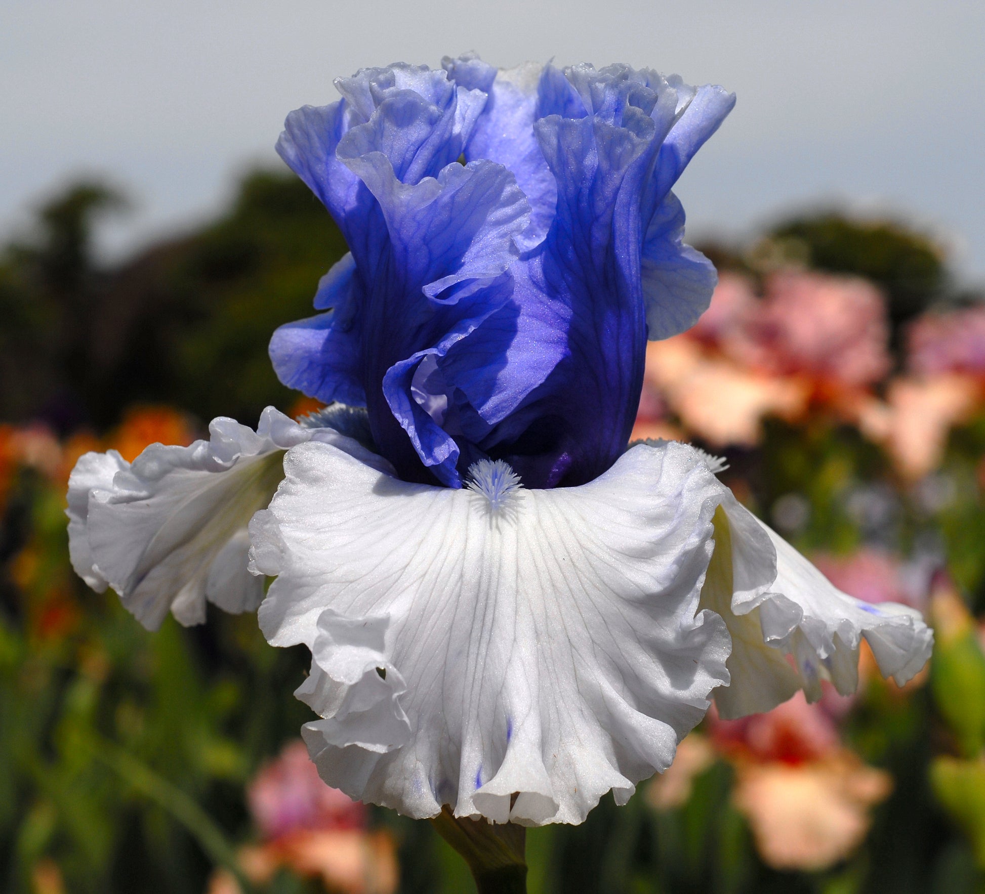 Early midseason bloom. Standards steeplechase blue central area shading to light blue edge, midrib flushed foxglove, style arms light blue falls white, foxglove shading in throat beside beard; beards cream at end, yellow in throat, with blue base; heavily ruffled.